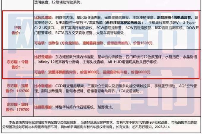 星越L将新增行云和东方曜·今朝2款新车型,从曝光的配置信息来看,行云版比长风版加了副驾座椅4向电动调节、女王副驾带一键放平/恢复功能等,预售价15.77万!